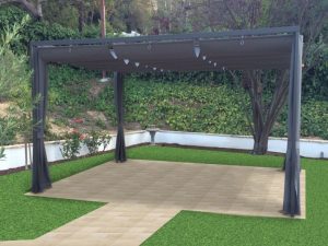 Light comes through the spaces in the panels. This creates a design on the surfaces below. You can order a slide wire canopy for pre-existing structures (including pergolas and patios) or have us build one that attaches to a new shade structure. The awnings are made in beautiful, UV-rated fabric and have stainless steel attachment hardware.